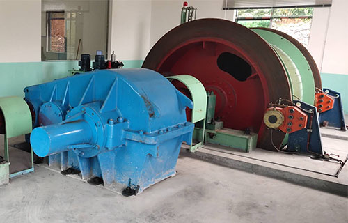 該提升機的主軸裝置有固定卷筒、活動卷筒(僅雙筒用)主軸、兩個軸承座、調繩機構(僅雙筒用)等部分組成,用來纏繞或釋放鋼絲繩。單筒提升機鋼絲繩為上出繩,雙筒提升機活動卷筒為下出繩,固定卷筒為上出繩,卷筒上裝有襯木。