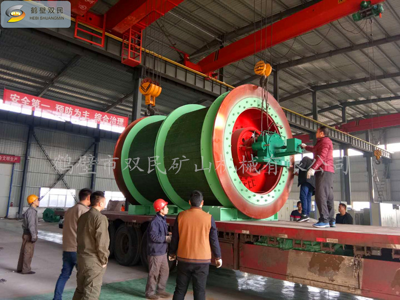 該提升機的主軸裝置有固定卷筒、活動卷筒(僅雙筒用)主軸、兩個軸承座、調繩機構(僅雙筒用)等部分組成,用來纏繞或釋放鋼絲繩。單筒提升機鋼絲繩為上出繩,雙筒提升機活動卷筒為下出繩,固定卷筒為上出繩,卷筒上裝有襯木。