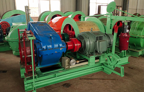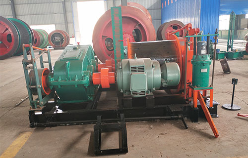 該提升絞車的主軸裝置有固定卷筒、活動卷筒(僅雙筒用)主軸、兩個軸承座、調繩機構(僅雙筒用)等部分組成,用來纏繞或釋放鋼絲繩。單筒提升絞車鋼絲繩為上出繩,雙筒提升絞車活動卷筒為下出繩,固定卷筒為上出繩,卷筒上裝有襯木。